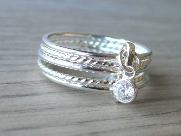 This gorgeous attached stacking ring set features 5 rings, all held together by a sterling silver rectangular bar with an attached sterling silver cubic zirconia charm. Three of the rings are plain sterling silver round bands and the other two have a twist pattern. The rings spin and move freely and independently of each other, but they are permanently connected by the silver bar so they will never get lost! I add a small 4-mm sterling silver charm with a clear cubic zirconia stone that dangles from the rectangular bar.