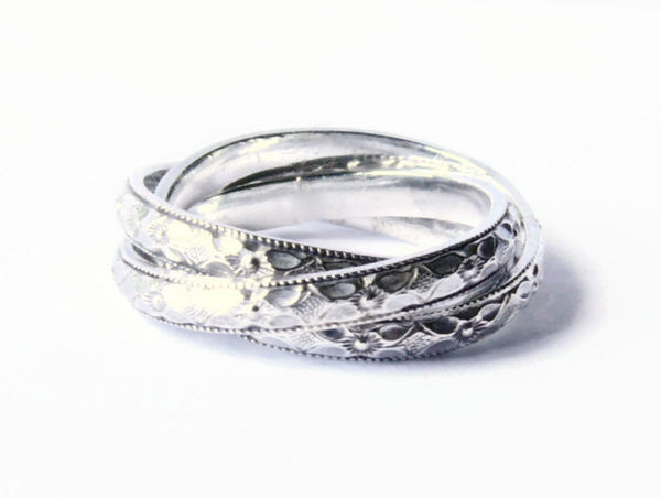 An amazingly unique alternative wedding band with three interlocking sterling silver bands with a floral pattern to form one rolling ring. There are 3 floral bands interlocked into this set, which slide over and around each other beautifully, making this a great fidget ring to play with!